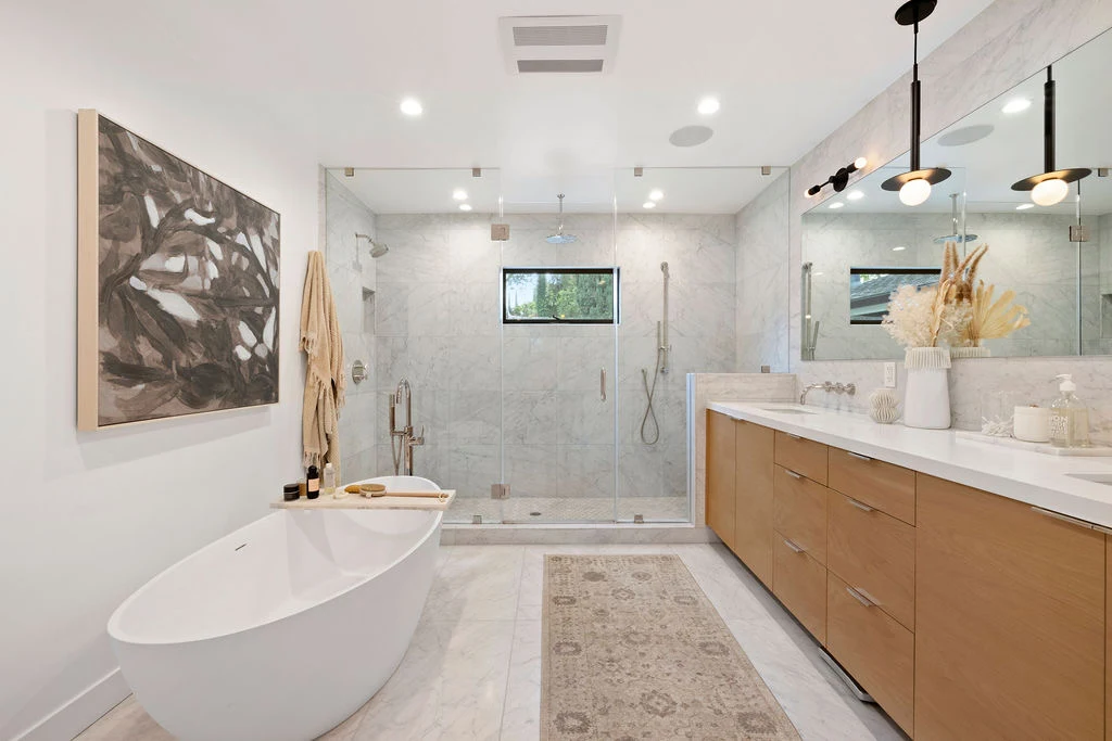 Bathrooms with curbless and walk-in showers, linear drains, heated floors, full waterproofing systems, moisture management, proper ventilation, and real storage. Full remodels: demolition, framing changes, plumbing and electrical upgrades, drainage correction, sound insulation, layered lighting, custom tile, niches, benches, vanities, mirrors, and durable finishes. Layout reconfigurations: tub-to-shower conversions, expanded showers, double vanities, improved circulation, and better accessibility. Comfort upgrades: heated surfaces, quiet exhaust fans, water-efficient fixtures, and long-term material performance. Accessibility: wider clearances, blocking for future grab bars, slip-resistant flooring, reachable storage, and aging-in-place planning.